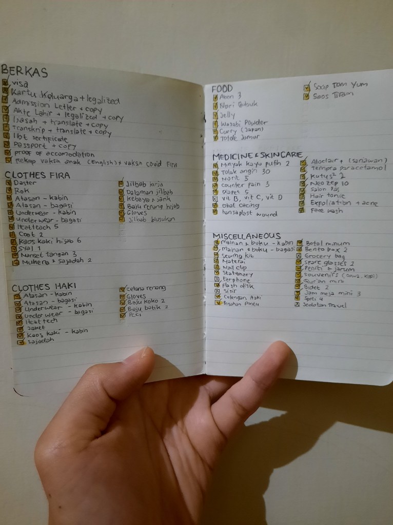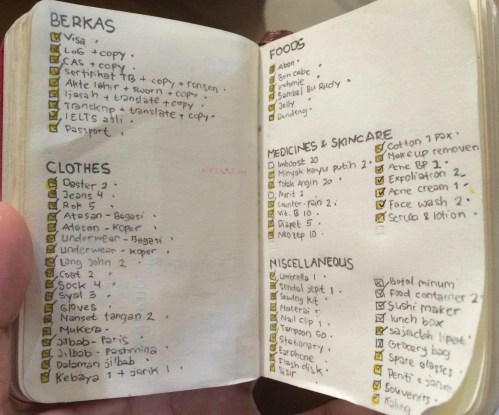 Selama di pesawat, Alhamdulillah tidak ada kendala karena sengaja memilih yang jam anak bobo. Sayapun sengaja bawa bekal untuk anak (terutama: protein), karena makanan di pesawat pasti rasanya menyengat. Mainan tentu saja: puzzle baru, stiker baru, buku pesawat etc. Satu koper kabin anak saya isi full dengan mainan. Untungnya, penerbangan tsb bukan penerbangan pertamanya anak karena pernah naik pesawat saat pengurusan visa ke Jakarta. Ohya tentang visa: (i) anakpun harus datang untuk appointment visa di kedubes belanda. Saya nanya (tepatnya: protes) ekplisit ke petugas yang meriksa berkas dan dijawab kalau anak baru lahirpun tetep harus dateng sendiri untuk dilihat mukanya; (ii) buat pengantar, ada cafe layak di samping lokasi appointment/persis seberang perpustakaan Erasmus Muis untuk menunggu. Masuknya dari pintu yang sama -> appointment belok kiri, ke perpus/cafe belok kanan. Tentang bandara, kalau bawa anak, jangan lupa minta prioritas saat ngantri. Di bandara Belanda, prioritas seperti ini otomatis akan diberikan (petugas inisiatif menyuruh kita langsung ke antrian prioritas). Tapi di Soetta, saya harus nego dulu ke petugasnya supaya bisa ga ikut ngantri di antrian panjanggg jemaah umrah sambil ngegendong anak yang tidur. Tentang barang bawaan, ini list saya saat saya single S2 dulu dan sekarang pas bawa buntut: