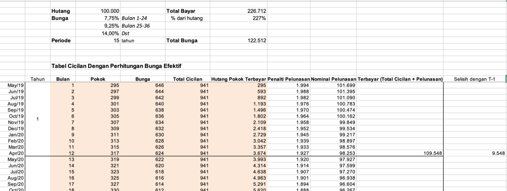 1. Kalau dihitung akumulasi cicilan yang sudah ditempuh selama 4 tahunan ini dan segala biaya administrasi bank (penalti pelunasan dkk), kami total membayar sekitar 140-an% dari uang yang kami pinjam.