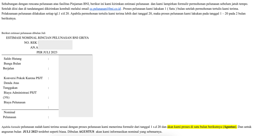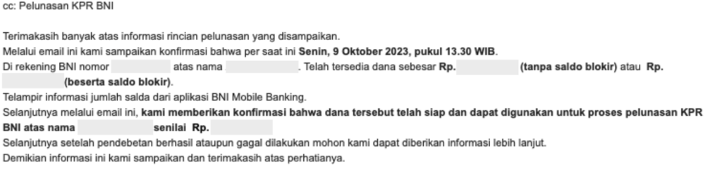 • Sehingga, kami hubungi cc.pelunasan@bni.co.id dengan melampirkan surat formulir permohonan pelunasan yang sudah kami tanda tangani. Dokumen template surat formulir permohonan pelunasan yang kami terima bisa dilihat di link ini.