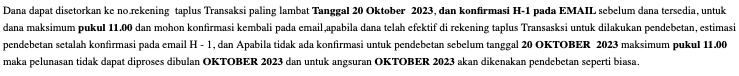 • Di hari yang sama (9 Oktober itu), kami balas emailnya seperti di bawah ini. Sebenernya, narasinya bebas, yang penting konfirmasi aja kalau kita acc pendebetan nominal X itu. Kami juga ga tau seharusnya di rekening harus tersedia nominal X dengan atau tanpa saldo blokir. Tapi, buat jaga-jaga, kami siapkan di rekening nominal X tanpa menghitung saldo blokir (jadi, anggep aja saldo blokir itu ga ada dan ga bisa didebet).