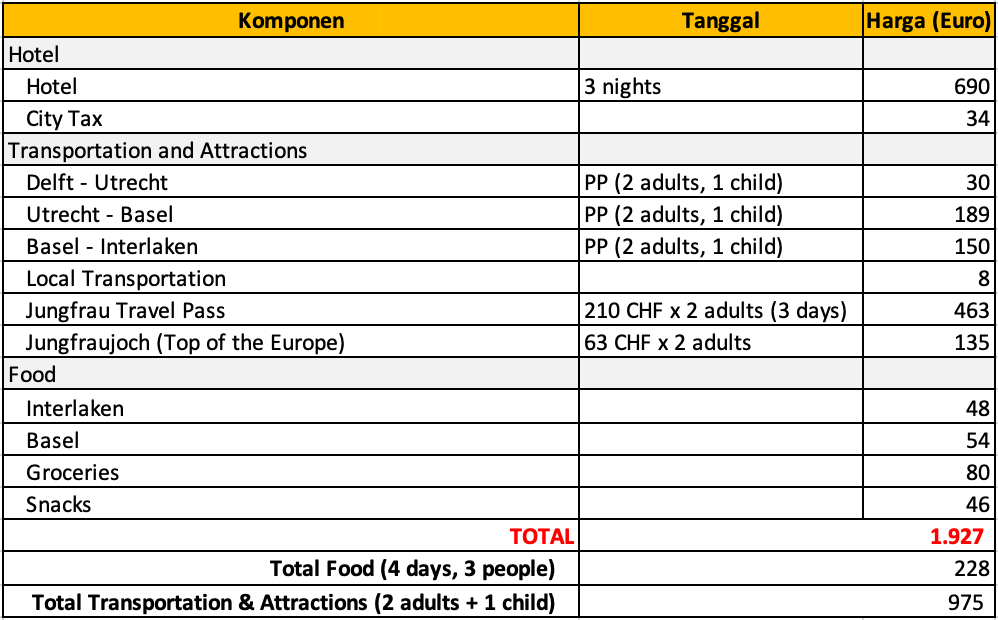 Total expense kami selama lima hari adalah 1900an euro. Komponen transportasi NL-Swiss-NL sangat murah sejujurnya (370an euro untuk tiga orang PP); yang kami sesali haha. Kalau diibaratkan, kursi kami setara kereta ekonomi di Indonesia yang kursinya keras dan tegak 90 derajat. Untungnya kami sudah reservasi kursi (nambah 16 euro bertiga). Kalau tidak reservasi kursi, sepanjang perjalanan bakal diusir-usir dari satu tempat ke tempat lain yang lowong, bahkan di tengah malem. Saya ga expect kursinya sepertinya ini sebenarnya, tapi saat mau upgrade ke kelas lain sudah telat jadi yasudah 10 jam-an perjalanan tahan-tahanin (btw, perjalanan lebih lambat 30-70 menit dari yang dijanjikan). Saya sarankan pilih weekday (Selasa/Rabu). Tapi ya tetep… kalau bisa ngulang waktu, kami bakal milih yang gerbong sleeper demi kenyamanan.